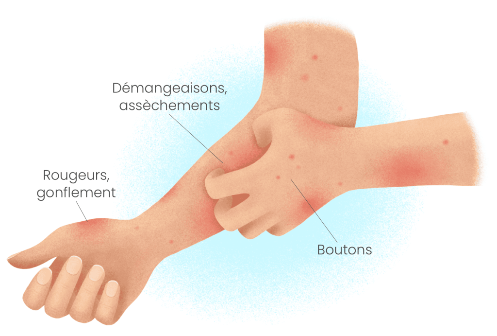Après la phase silencieuse de sensibilisation – qui peut durer plusieurs mois, années voire dizaines d’années – chaque contact entraîne une réaction de la peau au bout de 24 à 72h. Cela peut se traduire par différents symptômes : fortes démangeaisons, rougeurs, gonflement, assèchement de la peau, apparition de petites cloques, etc7. Aïe !