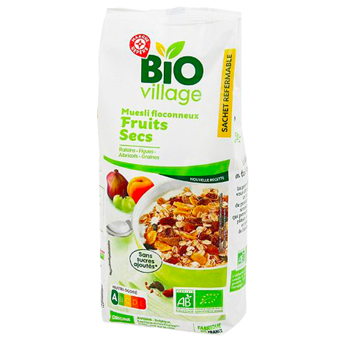 4 | ![]() | Muesli floconneux fruits secs - Bio Village (Marque Repère) Excellent - 93/100 Pas d'additifs, sans sucres ajoutés, biologique. |