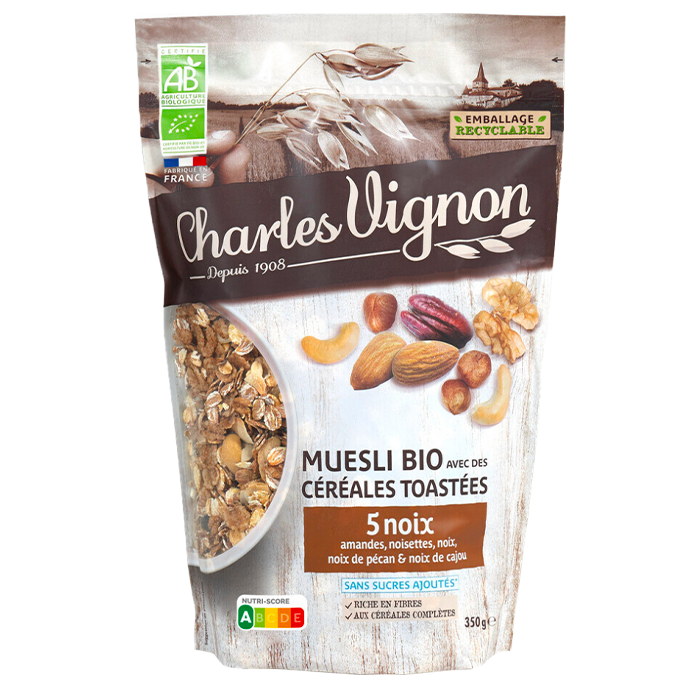 7 | ![]() | Muesli céréales toastées 5 noix - Charles Vignon Excellent - 94/100 Très faible teneur en sucre, pas d'additifs, biologique. |