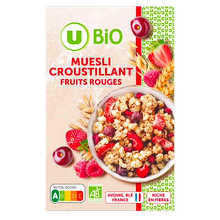 6 | ![]() | Muesli croustillant fruits rouges - U bio Excellent - 94/100 Aucun additif à risque, bonne quantité de fibres et protéines, biologique. |