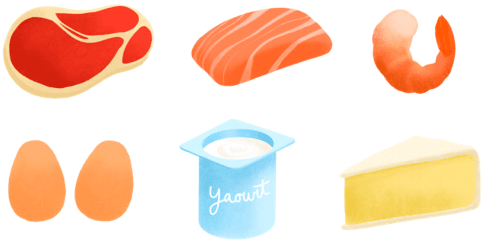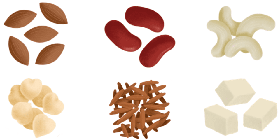 ![]() | Plants: legumes (lentils, chickpeas, red beans, etc.), whole grains (quinoa, buckwheat, etc.), tofu, nuts (walnuts, almonds, hazelnuts, etc.) |