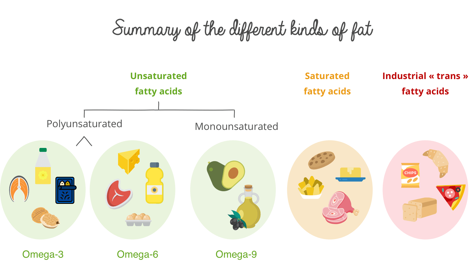 There are three categories of unsaturated fatty acids: omega-3, omega-6 and omega-9.