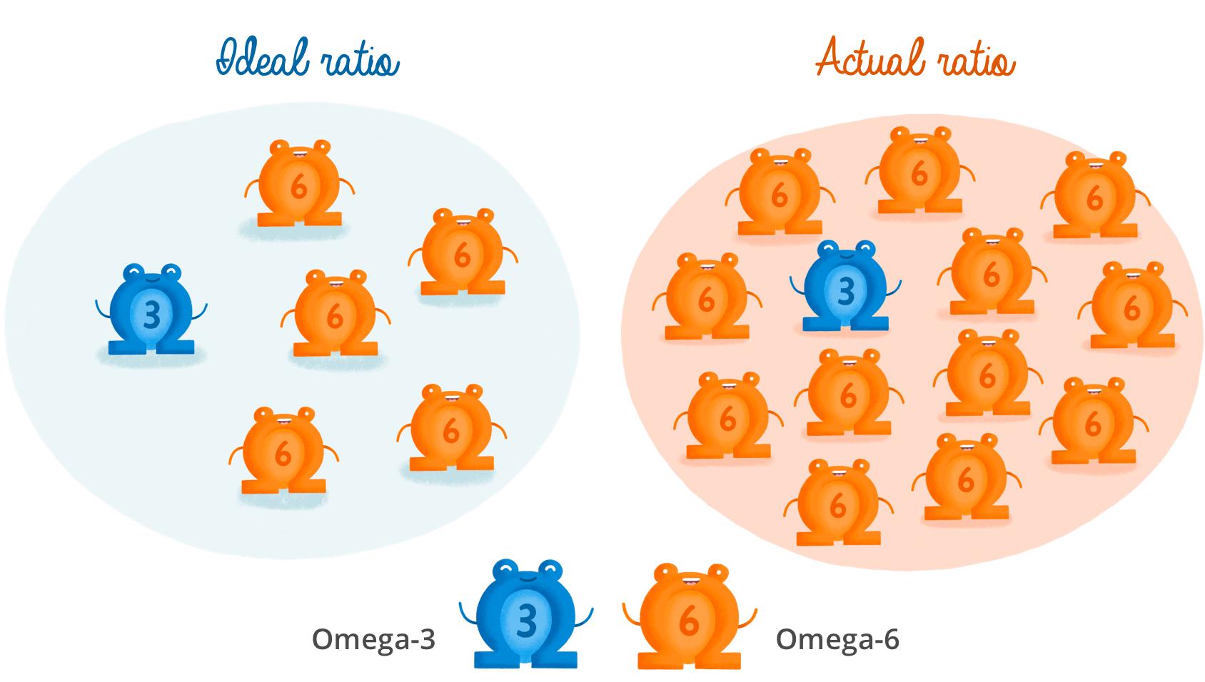 We should eat no more than five times more omega-6 than omega-3 fatty acids. But we actually consume 10 to 15 times more. Excessive omega-6 consumption interferes with our ability to metabolize omega-3 because they compete with each other, which means omega-3 fatty acids cannot do their job properly. This imbalance is one of the causes of cardiovascular disease.