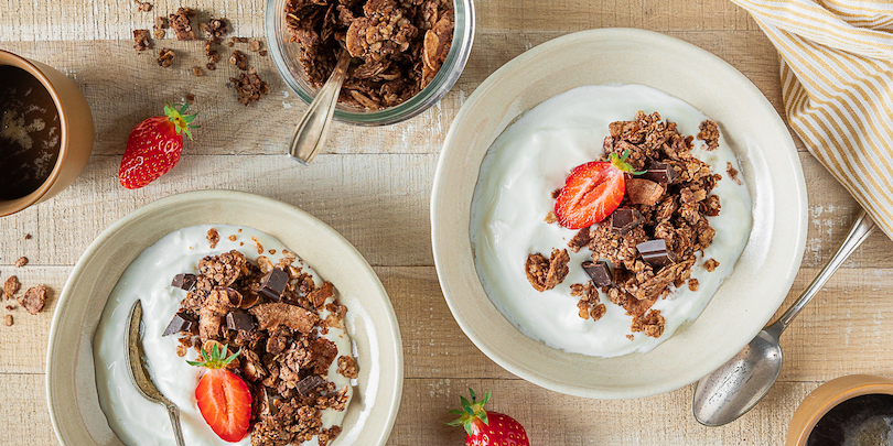 Serve the granola in a bowl with plant-based yogurt and any fresh seasonal fruit of your choice.