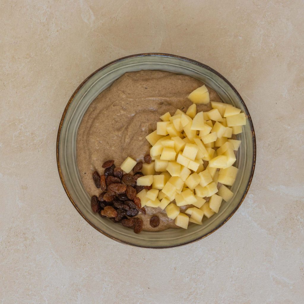Add the apples and raisins to the dough, and then mix to combine.