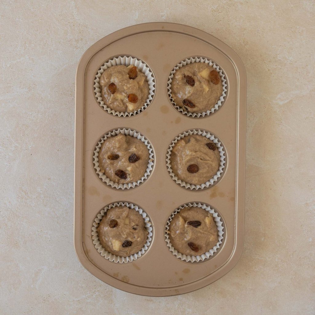Fill the muffin tins ¾ of the way. If you don’t have paper liners, lightly oil the molds. Then, bake for about 15 minutes in an oven preheated to 350°F.