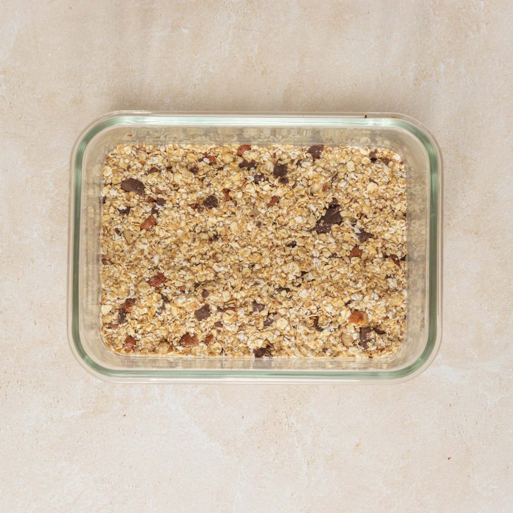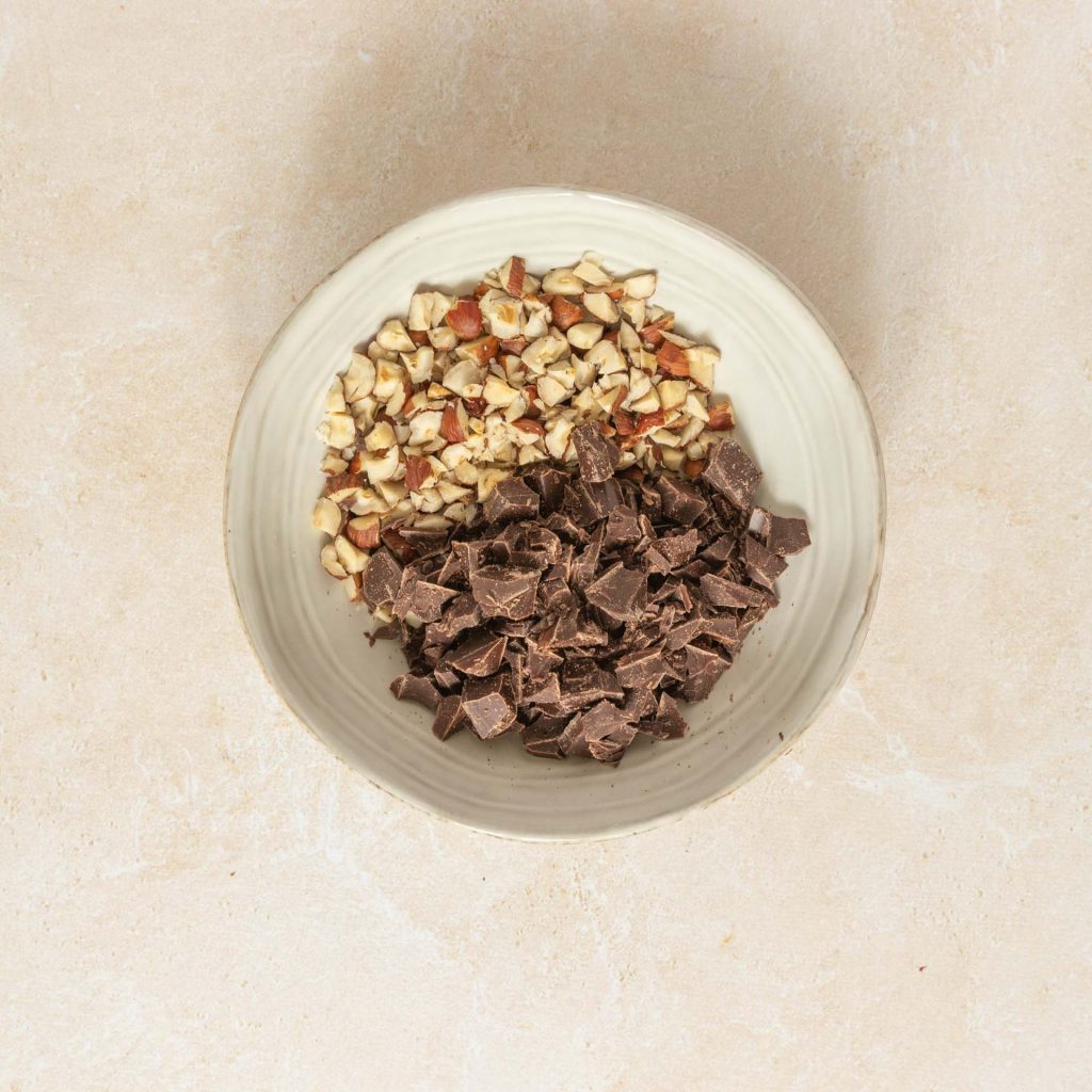 In a bowl, mix the oats, hazelnuts, chocolate, and compote. The mixture should be sticky, and all the dry ingredients should be coated with the compote (this works as a binder).