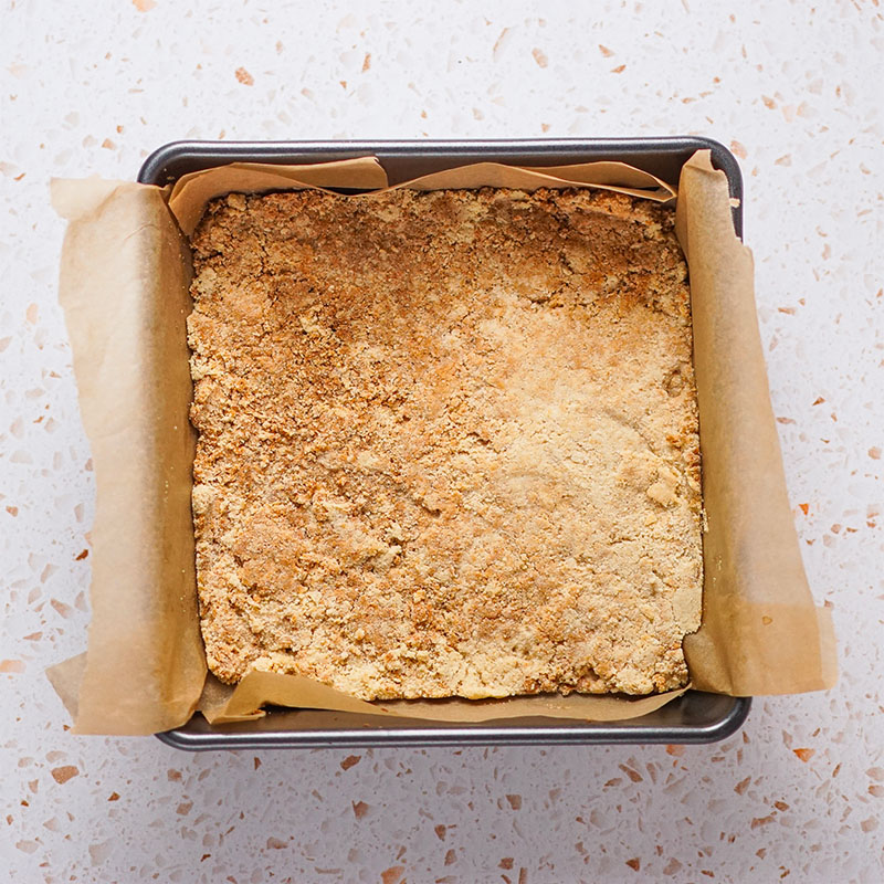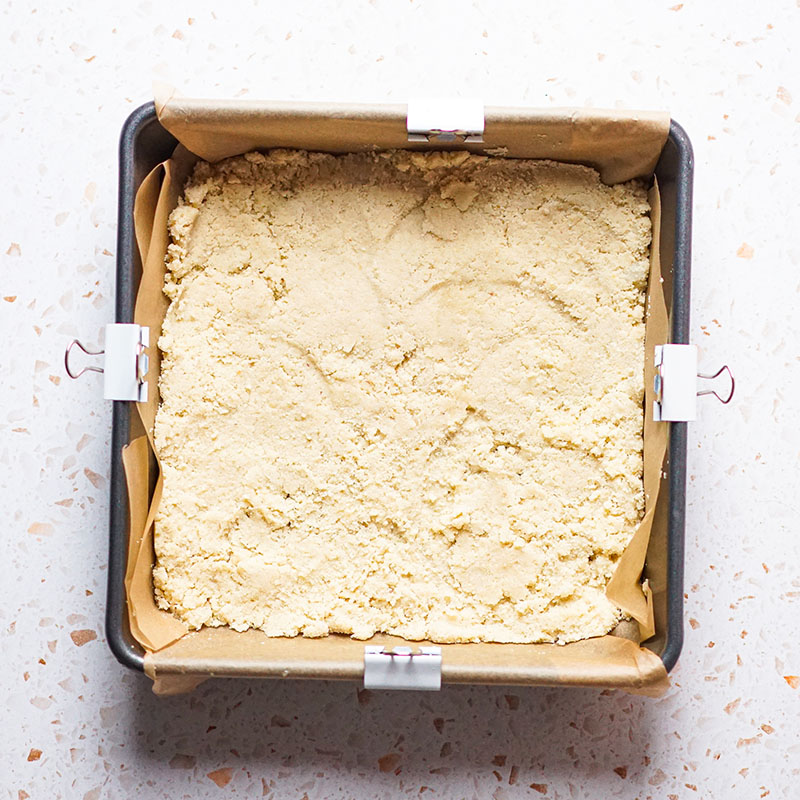 Preheat the oven to 325°F. For the crust, combine 2 cup almond flour, 4 tbsp melted coconut oil, 1 tbsp honey and add a pinch of sea salt. Then press into an 8×8 inch pan lined with parchment paper.