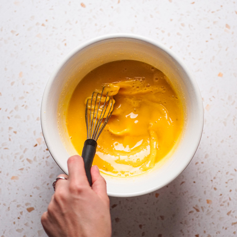 For the custard, use 1/2 cup of juice and 2 tbsp of zest and whisk them together with eggs, honey and 2 tbsp of almond flour until completely combined.