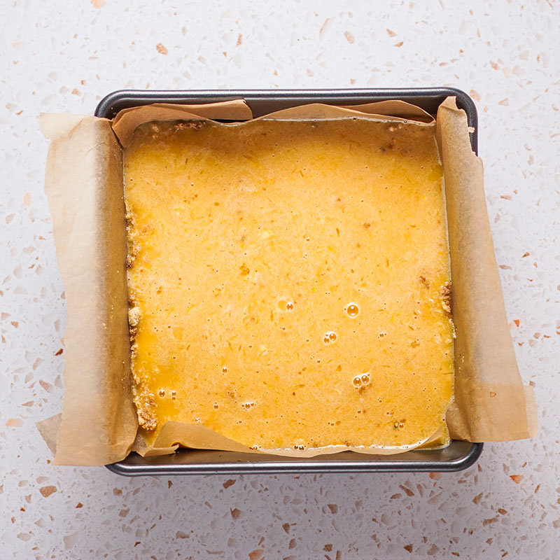 Once the crust is toasted, remove from the oven and carefully pour the lemon-mix over. Return to the oven for 20-25 minutes, or until the custard is set in the center with just a slight jiggle.