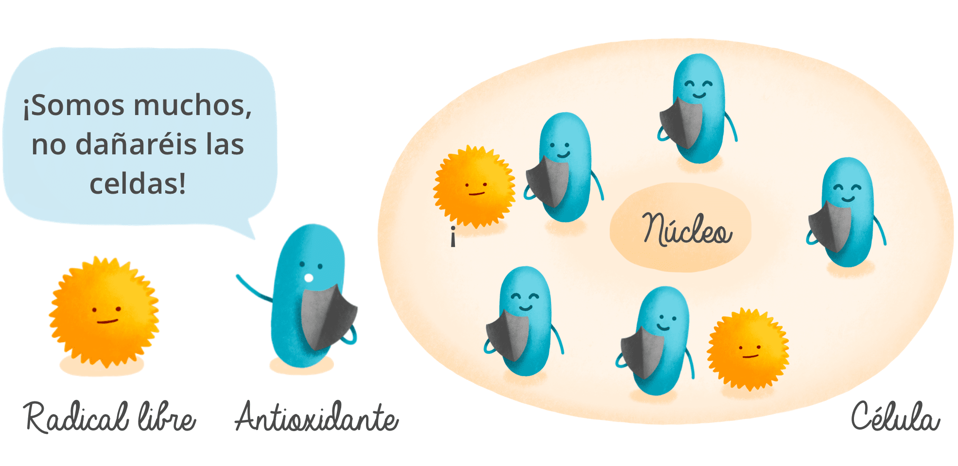 Por suerte, tenemos una forma de luchar contra estos radicales libres: los antioxidantes. Se trata de moléculas que se encuentran en la alimentación y que evitarán que los radicales libres oxiden nuestras células, es decir, que las dañen. El problema es que, con nuestro estilo de vida occidental actual, la producción de radicales libres por parte del organismo es demasiado alta en comparación con nuestro aporte de antioxidantes. El cuerpo ya no es capaz de defenderse él solo: sufre un estrés oxidativo, con las consecuencias que acabamos de enumerar. Por lo tanto, un aporte óptimo de antioxidantes es fundamental para luchar contra este estrés oxidativo.