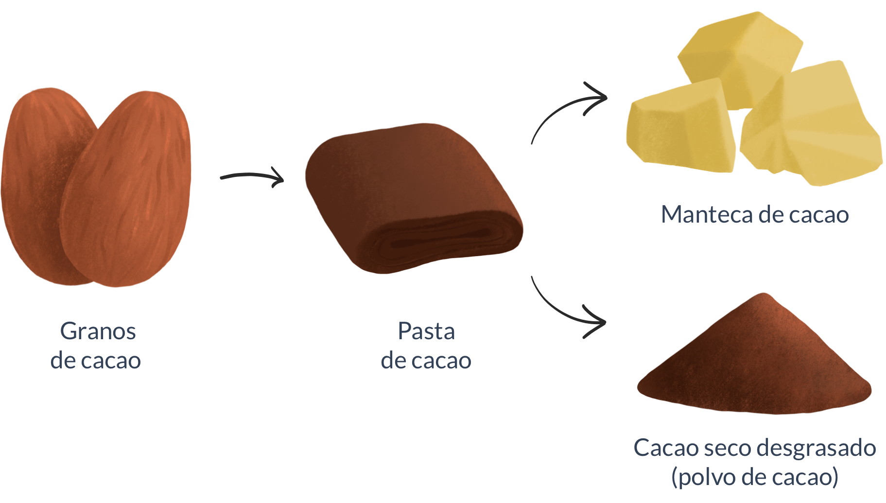 - La pasta de cacao, formada por los granos de cacao molidos. Esta pasta de cacao está constituida de forma natural por un 55 % de manteca de cacao y un 45 % de cacao en polvo.