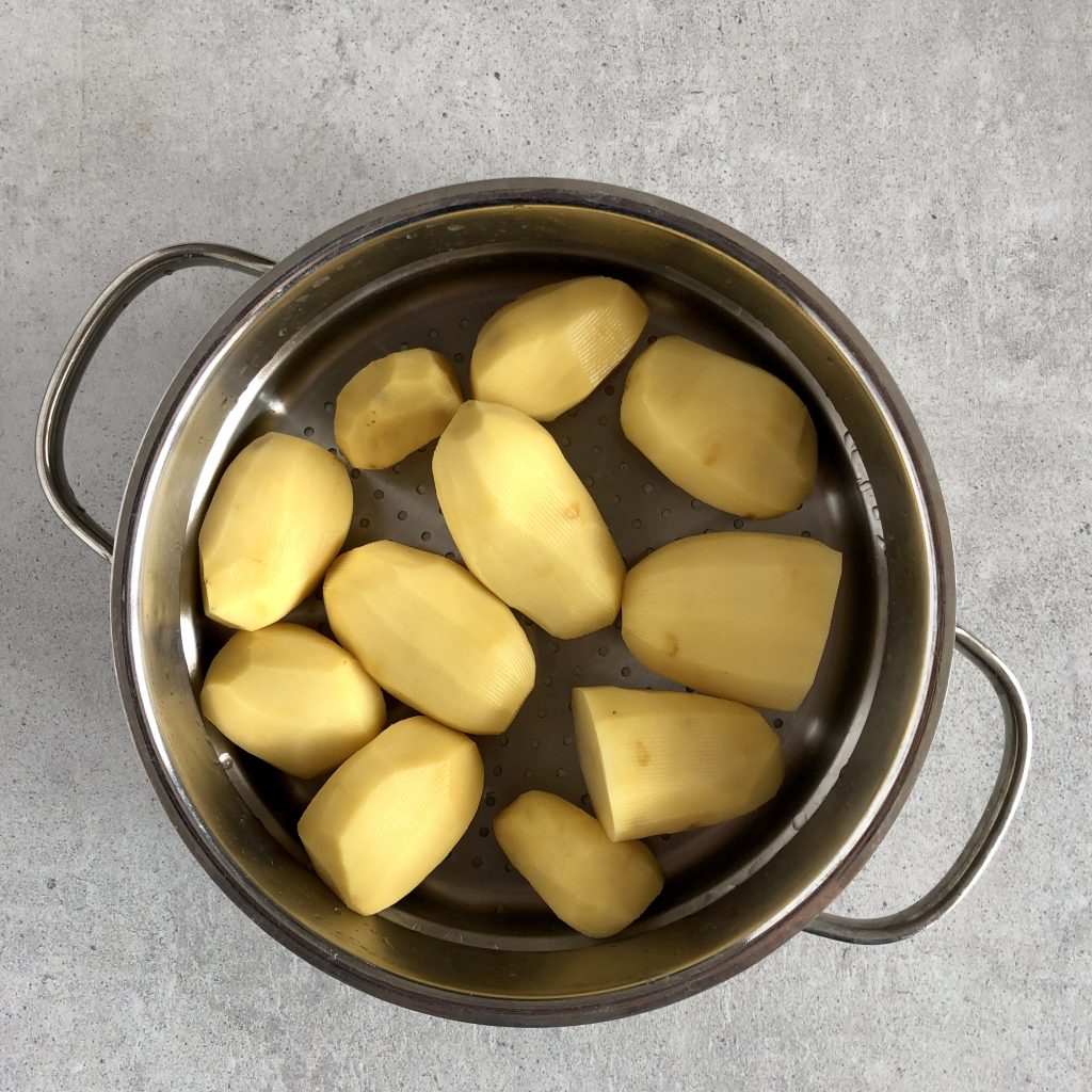 Pelar las patatas y cortarlas por la mitad (para acelerar la cocción). Ponerlas en una cacerola con agua fría y llevarlas a ebullición durante unos 20-25 minutos. Comprobar la cocción con la punta de un cuchillo: las patatas no se deben romper. Escurrir y dejar enfriar. Este paso se puede hacer el día anterior.