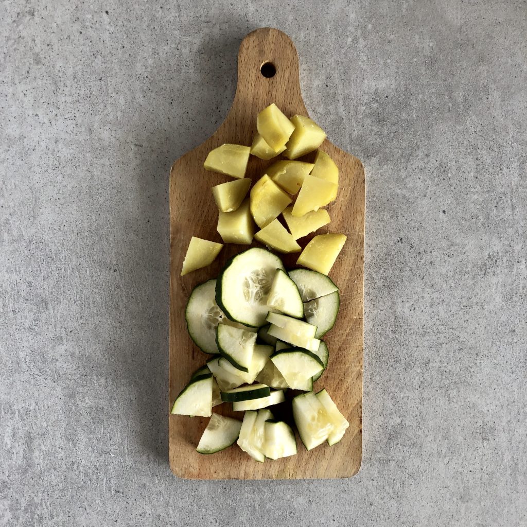 Lavar el pepino y cortarlo en trozos pequeños. Cortar las patatas frías en dados.