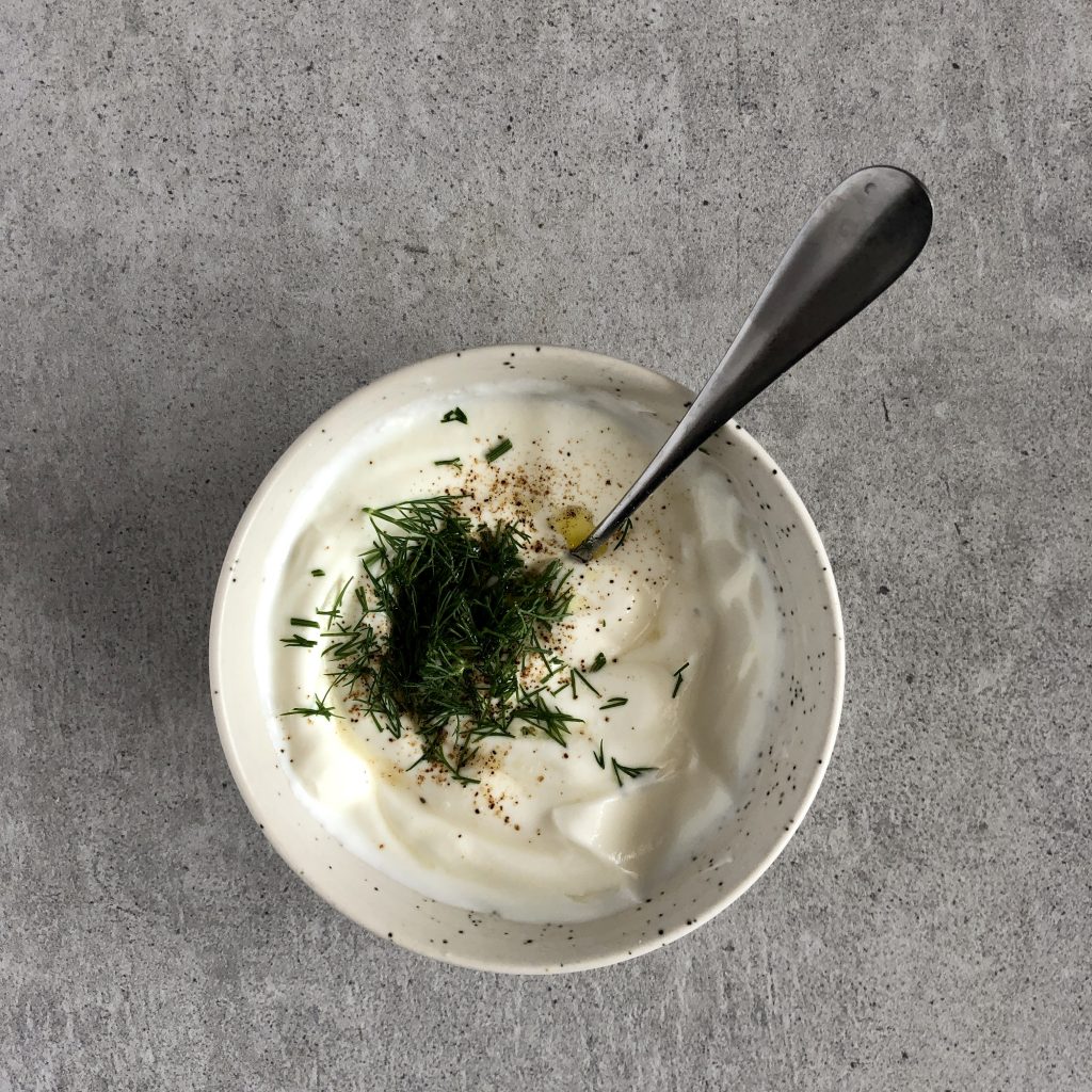 Preparar la salsa de yogur: poner el yogur en un cuenco. Añadir el zumo de limón, el aceite de oliva, el eneldo picado finamente (reservar un poco para decorar) y sazonar con una pizca de pimienta de Espelette, sal y pimienta.
