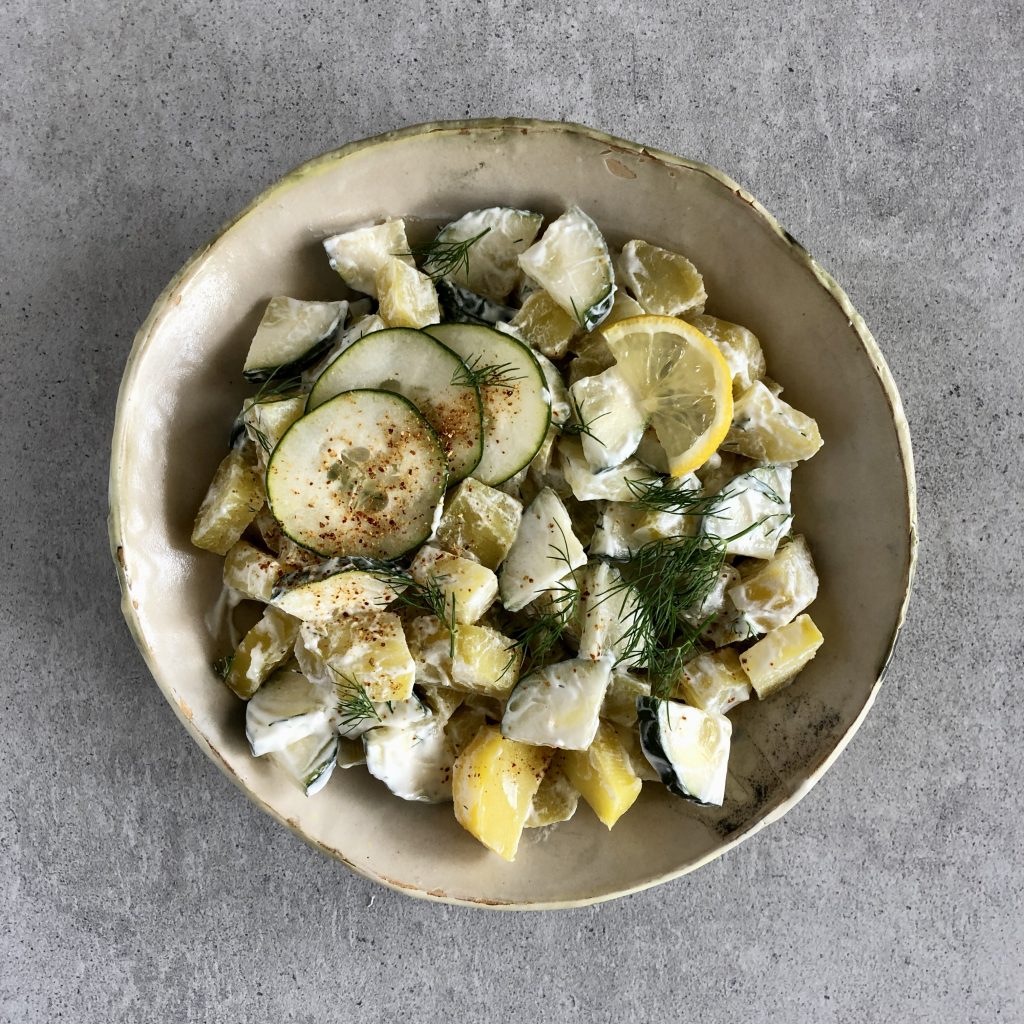 Esta ensalada de patata y pepino 🥒, muy rápida y fácil de hacer, se aliña con una salsa de yogur aderezada con limón y eneldo. Es muy probable que ya tengas a mano todo lo necesario para prepararla. Vamos, ¡que ya tienes listo el menú de tu próxima comida!
