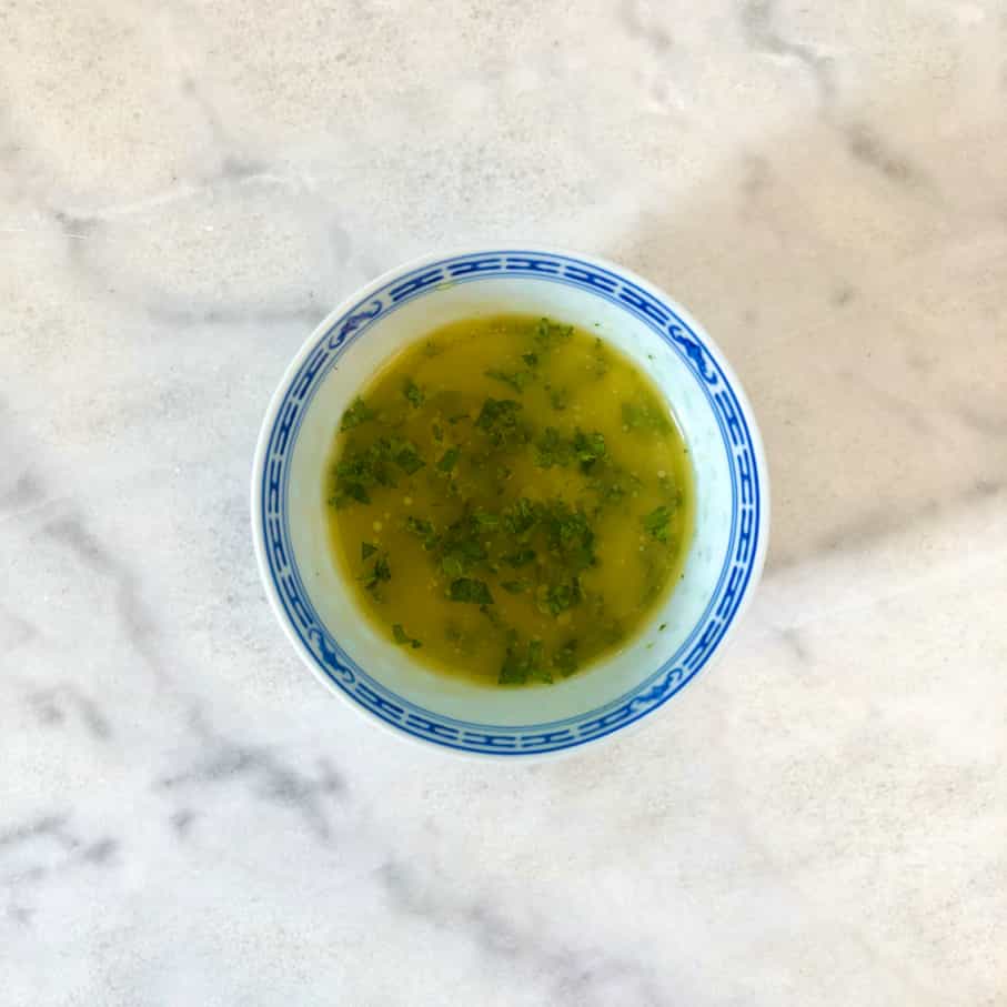 Preparar la salsa. En un tazón, mezclar la mostaza y el jugo de limón exprimido. Agregar el aceite de oliva y batir bien. Luego, cortar la menta finamente y agregarla a la preparación. Mantener fresco.