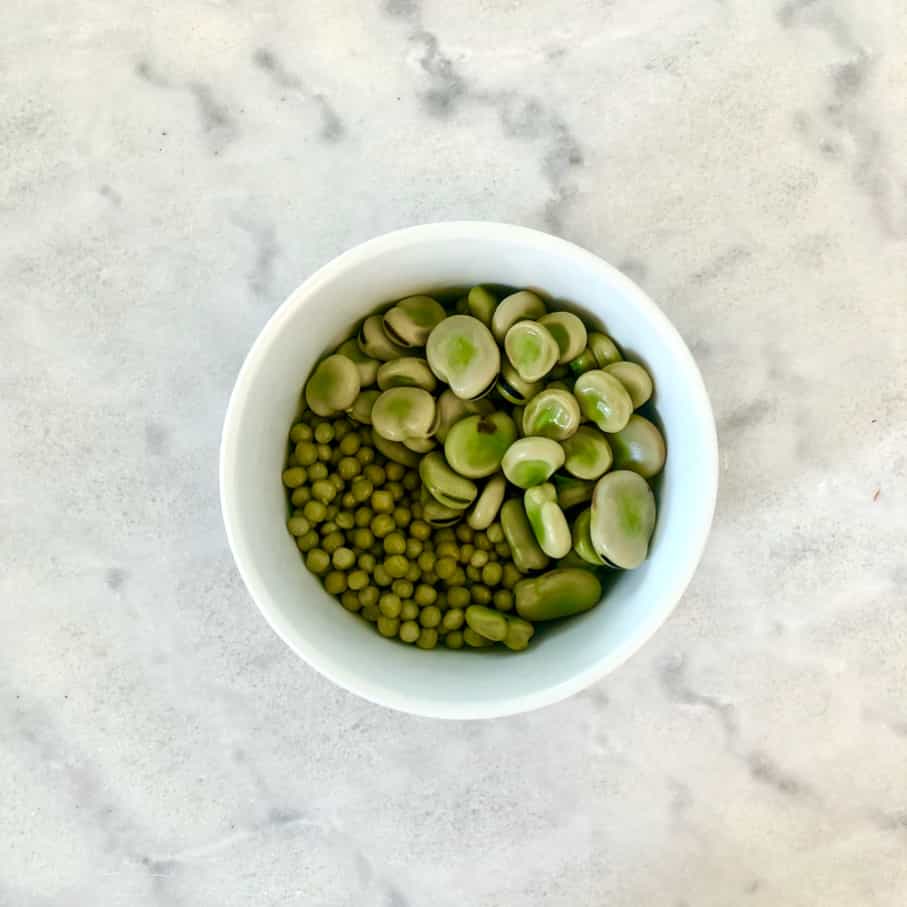 Pelar las habas y los guisantes. En una cacerola de agua con sal, cocinar las habas y los guisantes durante unos 15 minutos a fuego lento hasta que estén tiernos. Escurrir y lavar con agua fría para mantener su color verde brillante. Quitar la piel pequeña que rodea las habas.
