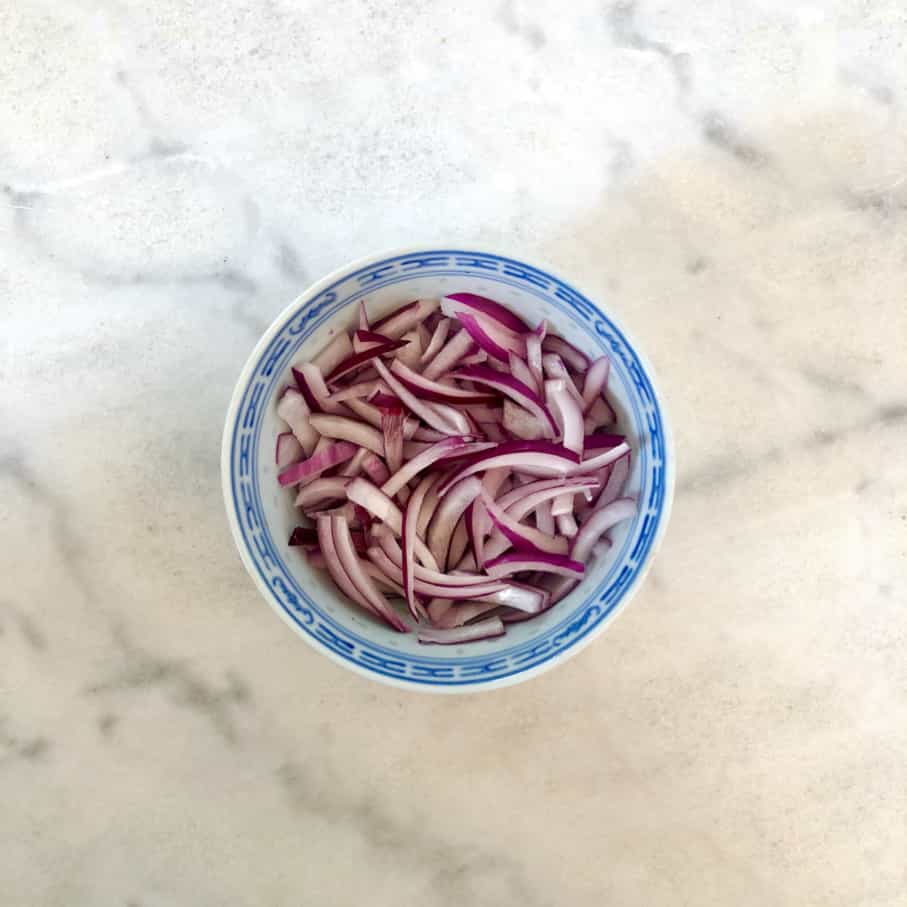 Picar finamente la cebolla roja. Luego, cortar el queso feta en dados pequeños.