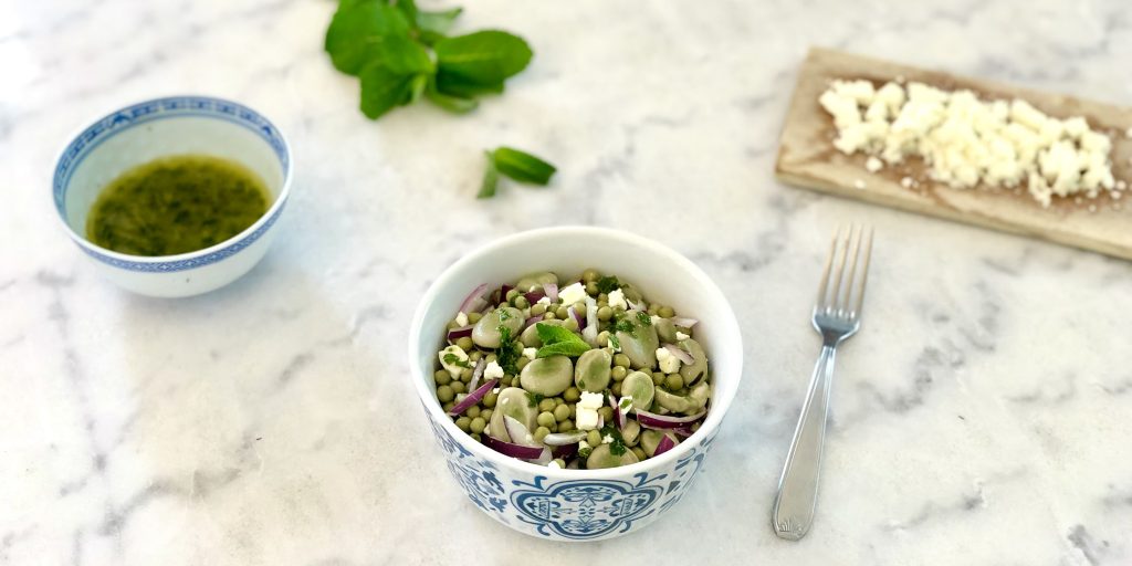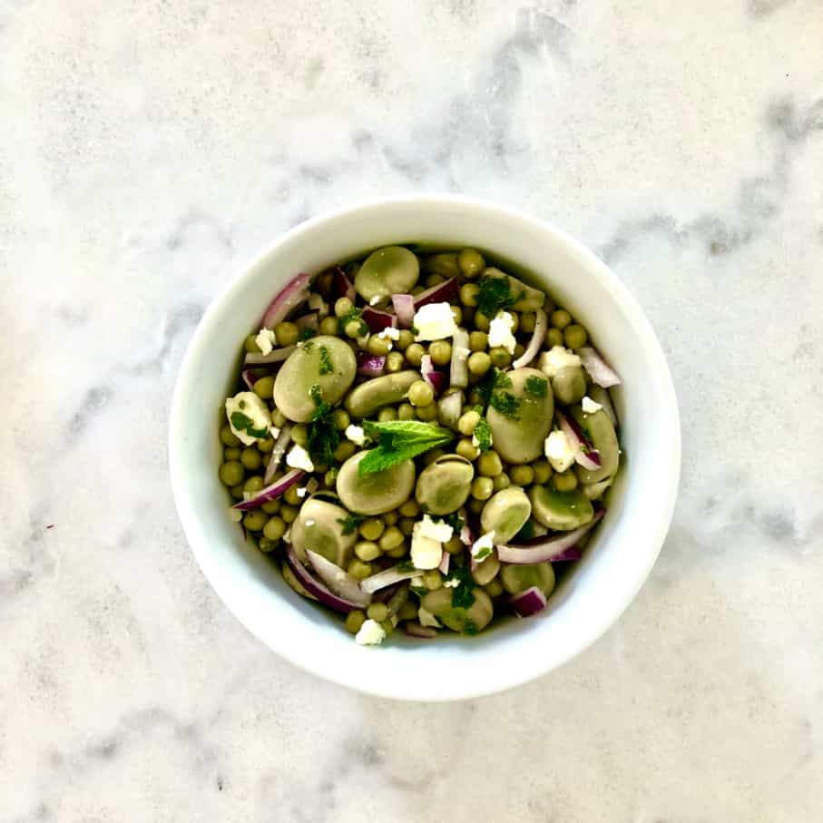 Mezclar las habas, los guisantes, la cebolla y el queso feta. Servir con la salsa de limón y menta.