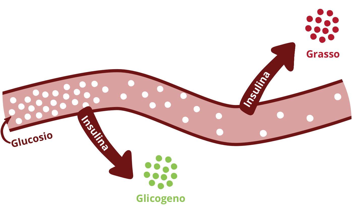 Come abbiamo visto prima, la capacità dell’organismo di immagazzinare glucosio sotto forma di glicogeno è limitata. Quando le riserve sono sature, l’insulina trasforma il glucosio in eccesso in grasso e lo deposita nell’organismo.