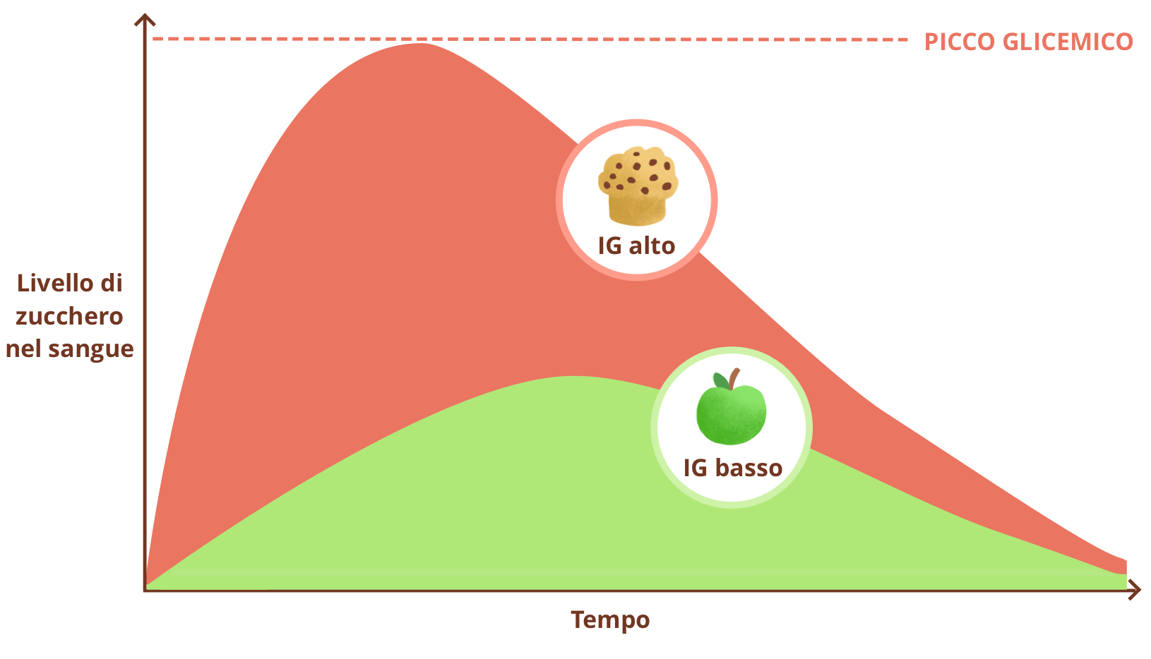 Consumare alimenti ad alto IG provoca picchi glicemici: i livelli di zuccheri nel sangue aumentano rapidamente e in modo esponenziale. L’organismo secerne quindi una quantità importante di insulina per abbassare la glicemia. Si tratta del cosiddetto “picco”, seguito da un abbassamento rapido dei livelli di zuccheri.