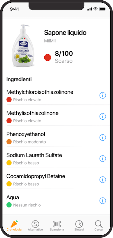 Rileva la presenza di olio di palma, glutine, lattosio o ingredienti di origine animale.