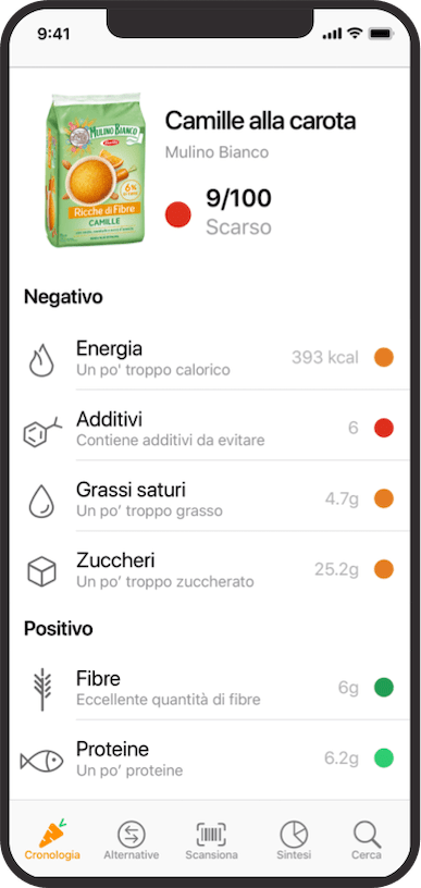 Yuka analizza i prodotti alimentari e ti spiega i dettagli della valutazione nella scheda di prodotto dedicata ad ogni prodotto.