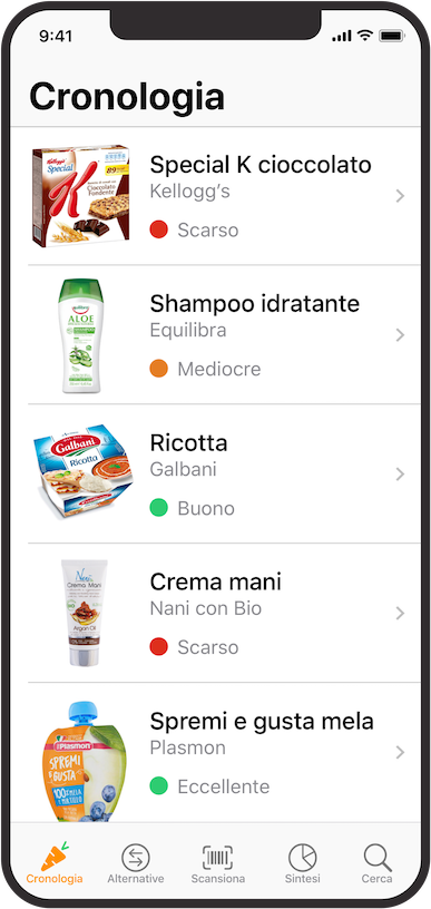 Yuka visualizza la cronologia dei prodotti scansionati. Puoi identificare l’impatto sulla salute di ogni prodotto tramite un codice colore semplice.