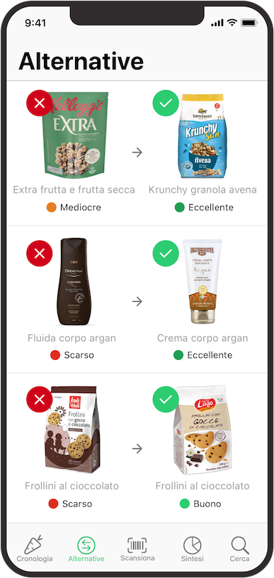 Per quanto riguarda i prodotti valutati scarsi o mediocri, Yuka ne suggerisce di simili ma più salutari, in modo del tutto indipendente.