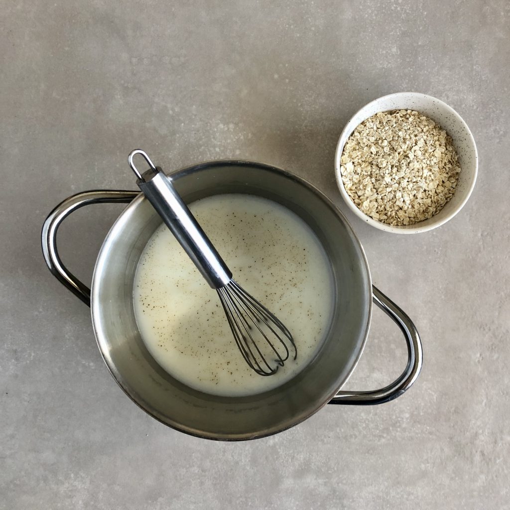 Portate il latte e l’acqua a ebollizione. Aggiungete i fiocchi d’avena, salate e pepate. Lasciate cuocere a fuoco basso per 3-5 minuti, mescolando regolarmente. I fiocchi d’avena dovranno assorbire tutto il liquido.