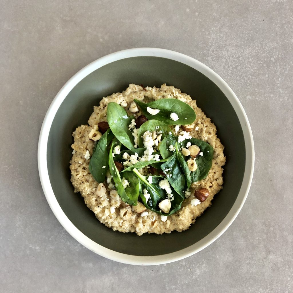 Versate il porridge in 2 ciotole. Coprite con una manciata di spinacino o rucola, il formaggio fresco di capra sbriciolato e le nocciole. Condite con un filo d’olio d’oliva e servite subito.