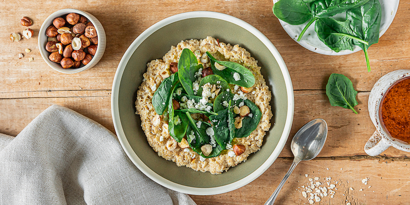 Il porridge 🥣 si prepara con il latte e i fiocchi d’avena. L’hai mai provato in versione salata? In questa ricetta, lo accompagniamo con spinacino, formaggio fresco di capra e nocciole. Pronto in soli 10 minuti, è l’ideale per fare il pieno di energia fin dal mattino.