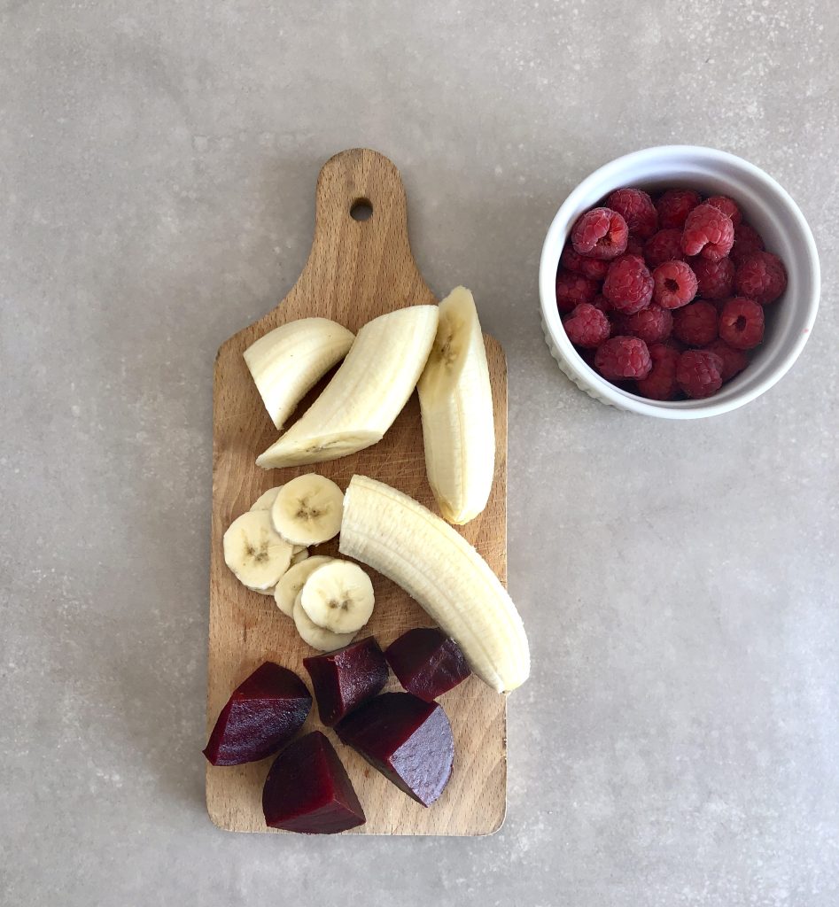 Sbucciate le banane. Tagliatene una a rondelle e mettetela da parte per servire. Tagliate la barbabietola a cubetti grossolani.