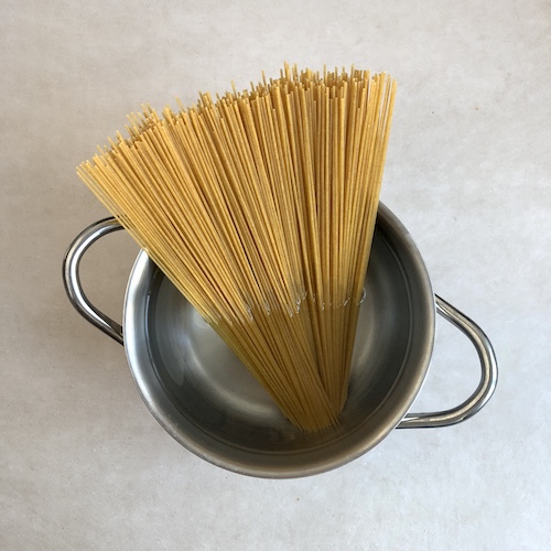Portate a ebollizione una pentola d’acqua salata e cuocete gli spaghetti al dente.