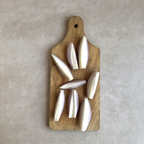 Pelate gli scalogni, tagliateli in due nel senso della lunghezza e poi ancora a metà fino a ottenere degli spicchi.