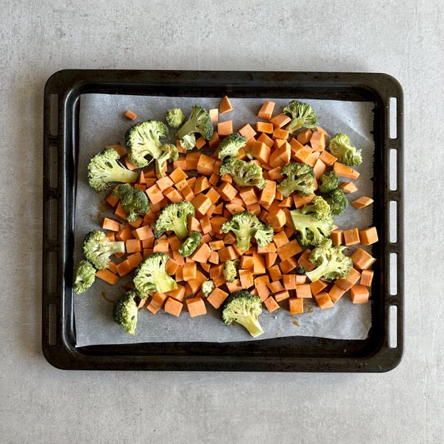 Preriscaldate il forno a 180°C. Sbucciate le patate dolci e tagliatele a cubetti. Lavate il broccolo e ricavatene le cimette. Disponete le verdure su una teglia rivestita di carta da forno. Irrorate con olio d’oliva, condite con paprika e sale e infornate per circa 25 minuti.