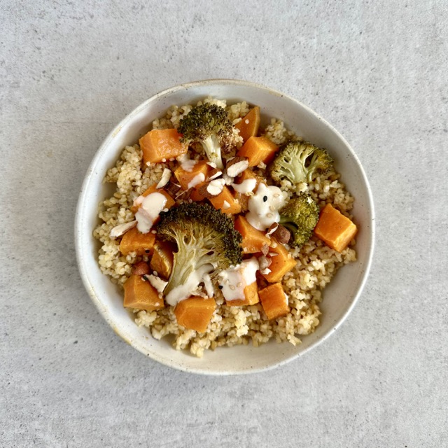 Collocate il bulgur in un piatto fondo, poi aggiungete le verdure al forno e unite la salsa tahini. Cospargete con le mandorle tritate grossolanamente e regolate il condimento se necessario.
