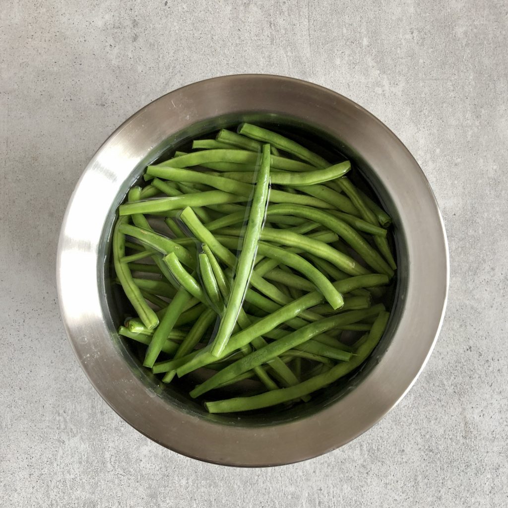 Lavate e scolate i fagiolini. Lessate per 8-10 minuti. A fine cottura, immergeteli in acqua ghiacciata per bloccare la cottura e mantenere il colore.