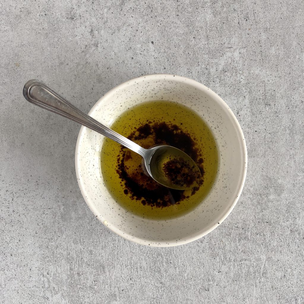Preparate la vinaigrette: in una ciotola, mescolate l’olio d’oliva, l’aceto balsamico, il miele, il sale e il pepe.