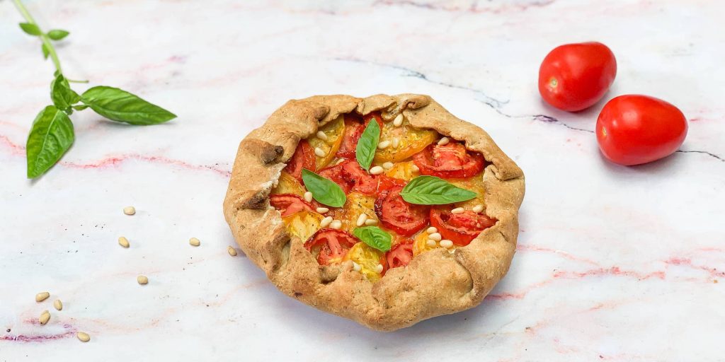 Lavate i pomodori e tagliateli a fette. Disponeteli sulla base, lasciando un bordo di circa 5 cm. Poi ripiegate i bordi dell’impasto, andando a coprire una parte dei pomodori. Infornate per circa 30 minuti. Se volete, versate un filo di sciroppo d’acero o miele sui pomodori per caramellarli.