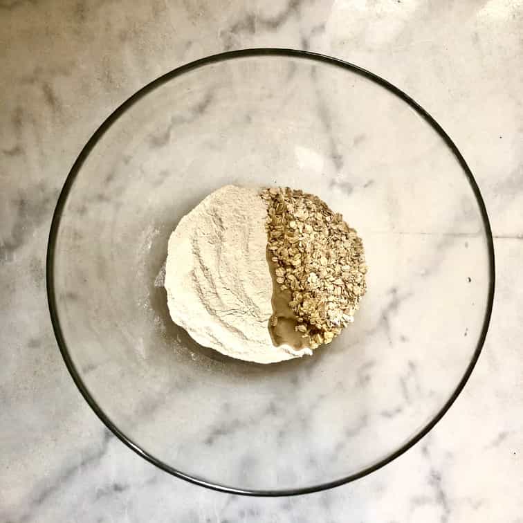 In una ciotola, mescolate la farina integrale, la farina di mandorle, i fiocchi d’avena e lo zucchero. Aggiungete l’olio d’oliva e mescolate, sbriciolando l’impasto tra le dita.