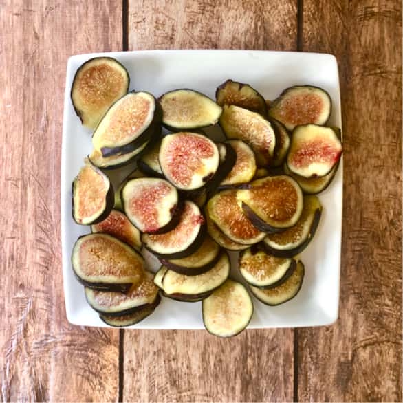 Sciacquate i fichi ed eliminate l’estremità . Poi tagliateli a fette. Preriscaldate il forno a 180°C.