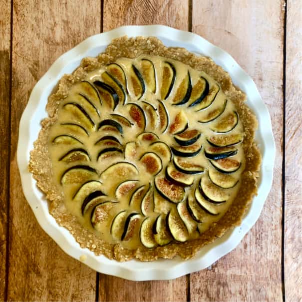 Versate il composto sulla base, poi disponetevi sopra i fichi. Infornate la crostata per 30 minuti.