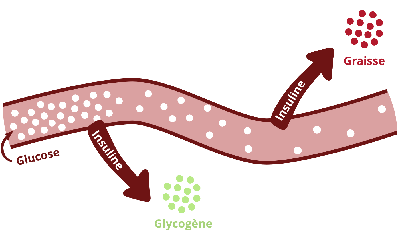Comme nous l’avons vu plus haut, les capacités de mise en réserve du glucose sous forme de glycogène sont limitées. Lorsque le stock est saturé, l’insuline va alors transformer et stocker l’excès de glucose sous forme de graisses.
