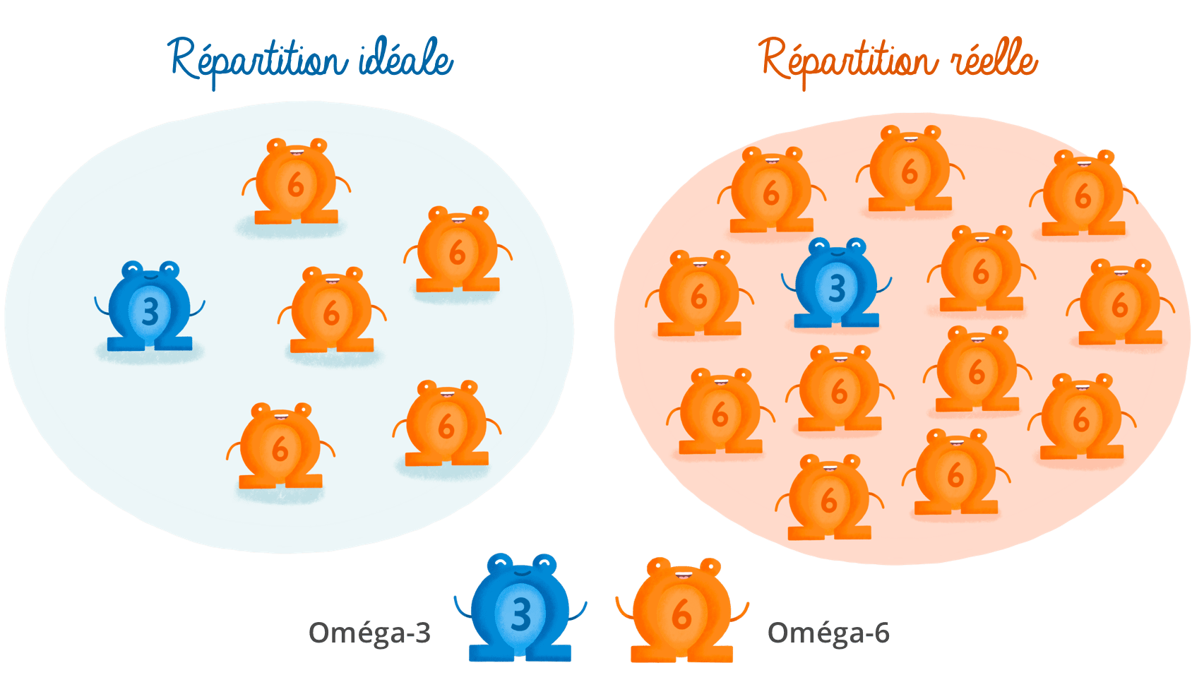 - C’est bien ou pas ? Les Oméga-6 sont des graisses indispensables impliquées dans de nombreuses fonctions comme la reproduction, les défenses immunitaires ou encore le développement cérébral. Mais, tout comme les graisses saturées, nous les consommons aujourd’hui en excès par rapport à nos besoins, ce qui augmente le risque de maladies cardio-vasculaires. Notre consommation d’Oméga-6 est particulièrement déséquilibrée par rapport à notre consommation d’Oméga-3.