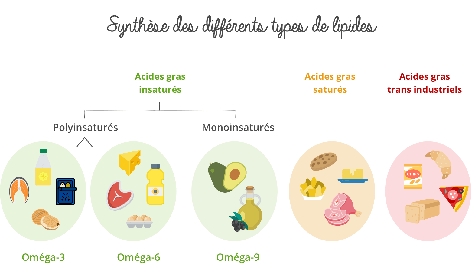 - C’est quoi ? Ce sont des acides gras que nous pouvons fabriquer nous-mêmes à partir des graisses saturées que l’on consomme, et que l’on retrouve aussi directement dans certains aliments.