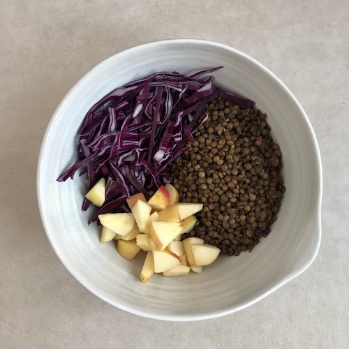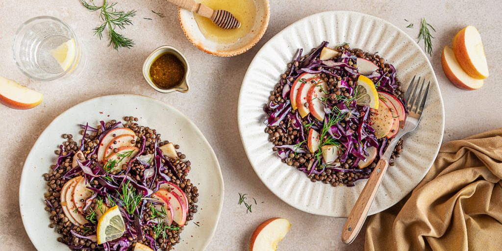 Dans un saladier, mélangez les lentilles, le chou rouge et les pommes. Arrosez avec la vinaigrette puis ajoutez les brins d’aneth ciselés. Ajustez l’assaisonnement selon votre goût.