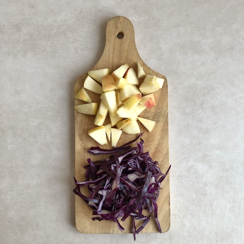 Lavez la pomme, coupez-la en deux et retirez les pépins puis taillez des cubes. Arrosez-les d’un filet de jus de citron. Émincez finement le chou rouge.