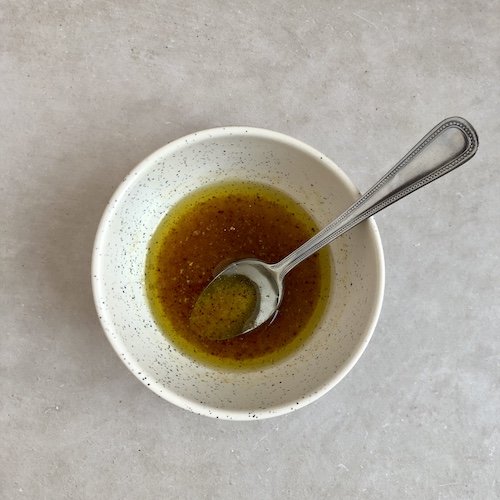 Réalisez la vinaigrette : dans un bol, mélangez l’huile d’olive, le vinaigre de cidre et le miel. Assaisonnez avec du piment d’Espelette, du sel et du poivre.